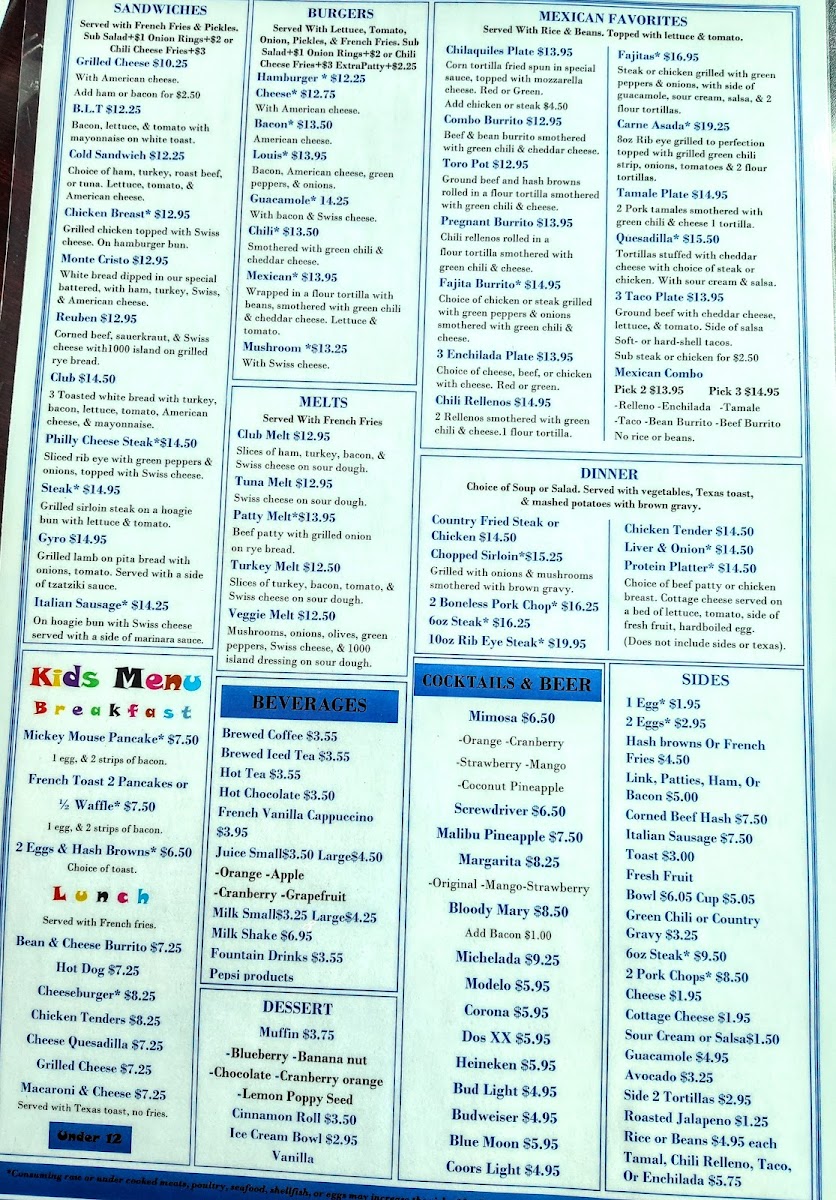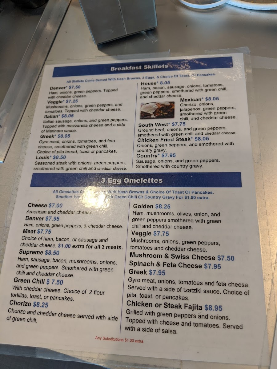 - Breakfast Skillets: Includes options such as the Denver skillet with ham, onions, green peppers, and Cheddar cheese, and a Greek Gyro skillet featuring gyro meat, onions, tomatoes, Feta cheese, and green chili, served with a choice of pita bread, toast, or pancakes.