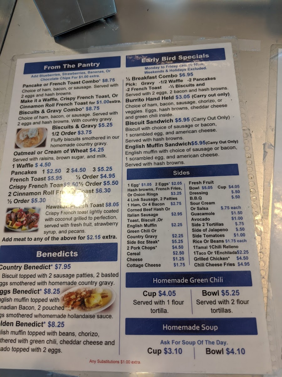 - Specialty Plates and Sandwiches: Highlights include Hawaiian French Toast, Huevos Rancheros, Cheese Omelets with Pancakes, Biscuits and Gravy, Breakfast Sandwiches, Chile Relleno Breakfast Plates, Reuben Sandwiches, and Enchilada Plates.